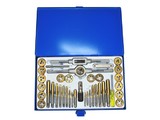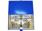 合金钢制造,铁盒包装。内含:17支扳牙:M3*0.5 、M4*0.7、 M5*0.8 、M6*1.0 、M7*1.0 、M8*1.25、 M10*1.5 、M12*1.75、 1/8NPT27、 4NC40 、6NC32 、8NC32 、1/4NC20、 5/16NC18、 3/8NC16 、7/16NC14、 1/2NC13;17支丝锥,1支扳牙扳手,1支丝锥扳手,T型丝锥扳手,1支牙规,1支螺丝批。