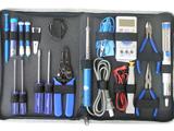 内含工具包括:三角爪一支、焊锡丝一支、1.4mm一字精密螺丝批一支、2.4mm一字精密螺丝批一支、散热夹一个、3*75十字螺丝批一支、3*75一字螺丝批一支、5*75十字螺丝批一支、5*75一字螺丝批一支、剥丝钳一支、烙铁架一支、30W电烙铁一支、防静电腕带一支、万用表一支、IC导入器一支、迷你斜嘴钳一支、迷你尖嘴钳一支、吸锡泵一支、帆布包一个。