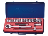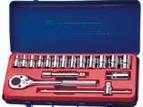 内含工具包括:13支12.5mm套筒:8、10、11、12、13、14、15、17、19、21、22、23、27mm;1支12.5mm加长套筒头:21mm;1支12.5mm滑杆:250mm;1支12.5mm延长扳杆:120mm;1支12.5mm棘轮扳杆:1/2"*250mm;铁盒:370*150*50mm。