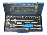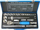 内含工具包括:18支12.5mm套筒:10、11、12、13、14、15、16、17、18、19、20、21、22、23、24、27、30、32mm;2支12.5mm加长套筒头:16、21mm;1支12.5mm滑杆:250mm;1支12.5mm万向接头;2支12.5mm延长扳杆:5"、10";1支12.5mm棘轮扳杆:1/2"*250mm;铁盒:370*150*50mm。
