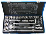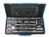 内含工具包括:22支1/2"DR.十二角短套筒:8、9、10、11、12、13、14、15、16、17、18、19、20、21、22、23、24、26、27、28、30、32mm;3支1/2"DR.接杆:3" 5" 10";1支套筒三用接头:F1/2-M3/8;1支螺批套筒:52mm;1支1/2"DR.万向接头;1支1/2"DR.棘轮套筒扳杆;2支1/2"DR.火花塞套筒:16mm、21mm;1支1/2"DR.L型扳杆:10"。