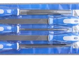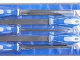 优质高碳钢,特殊热处理,硬度高,耐磨;双色手柄;内含5支E0014-8"钢锉,分别是:丸、半丸、三角、平(粗齿)、平(细齿)。